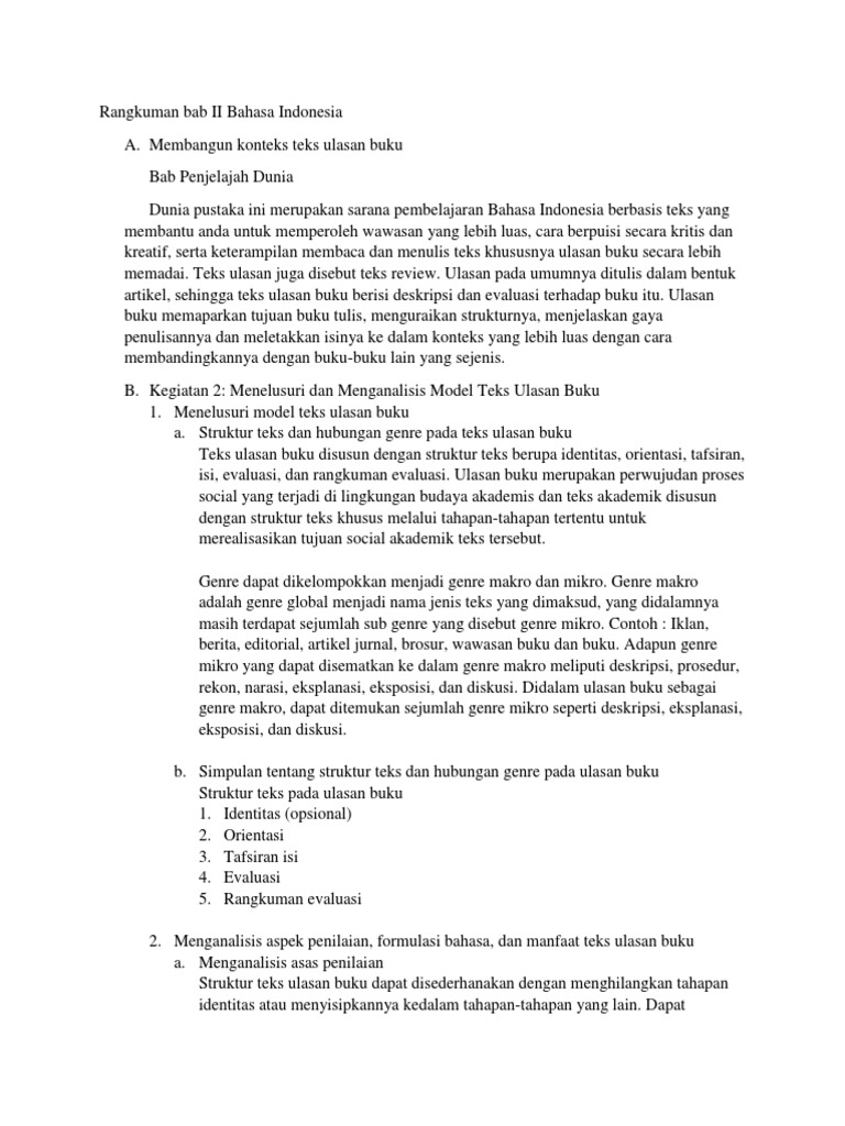 Bahasa Indonesia Bab Ii from image.slidesharecdn.com Teks ulasan merupakan suatu teks yang berisi ulasan, penilaian atau review terhadap suatu karya seperti film, drama, atau sebuah buku. Contoh teks ulasan novel 99 cahaya di langit eropa. Teks ulasan ini umumnya dilakukan pada karya fiksi guna mendapatkan gambaran jelas tentang manfaat, pentingnya informasi, dan kekuatan argumentatif yang dituangkan penulis di dalam suatu. Hal ini disebabkan sikap kritis dalam mengulas teks ulasan tidak lepas dari norma. Teks ulasan membantu dalam menilai keadaan karena emang itu tugasnya. Manfaat teks ulasan sendiri dapat dirasakan oleh 3 kalangan yang berbeda: Teks ulasan merupakan salah satu jenis teks yang memberikan pembahasan atau memberikan ulasan tentang suatu karya seni maupun karya yang dihasilkan oleh orang lain. Ialah merupakan sebuah teks yang mana didalamnya memuat suatu ulasan/penilaian/review mengenai suatu hasil karya (film atau drama).